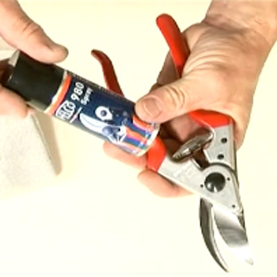 Voor het soepel houden van je snoeischaar is onderhoudsspray belangrijk. Deze kan je het beste spuiten bij de onder- en bovenmes en vergeet de veer ook niet in te spuiten.