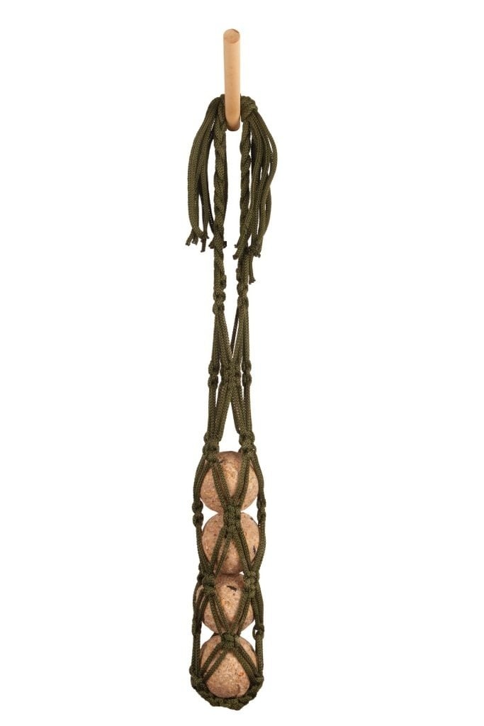 De trendy macramé vetbolhouder is niet alleen functioneel, maar ook nog eens ecovriendelijk. Gemaakt van gerecycled PET touw! Je draagt bij aan een duurzame levensstijl terwijl je geniet van het observeren van vogels in je tuin. Met deze vetbolhouder geknoopt in een patroon voeg je niet alleen een stijlvolle touch toe aan je buitenruimte, maar help je ook de planeet te beschermen door afval te verminderen.